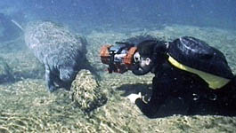 Students shoot surface footage of Jonathan Bird and Greg Brunshidle preparing to search for manatees in a canal of the Crystal River. |